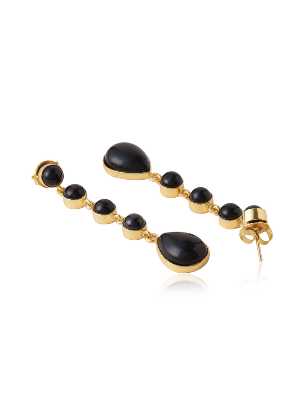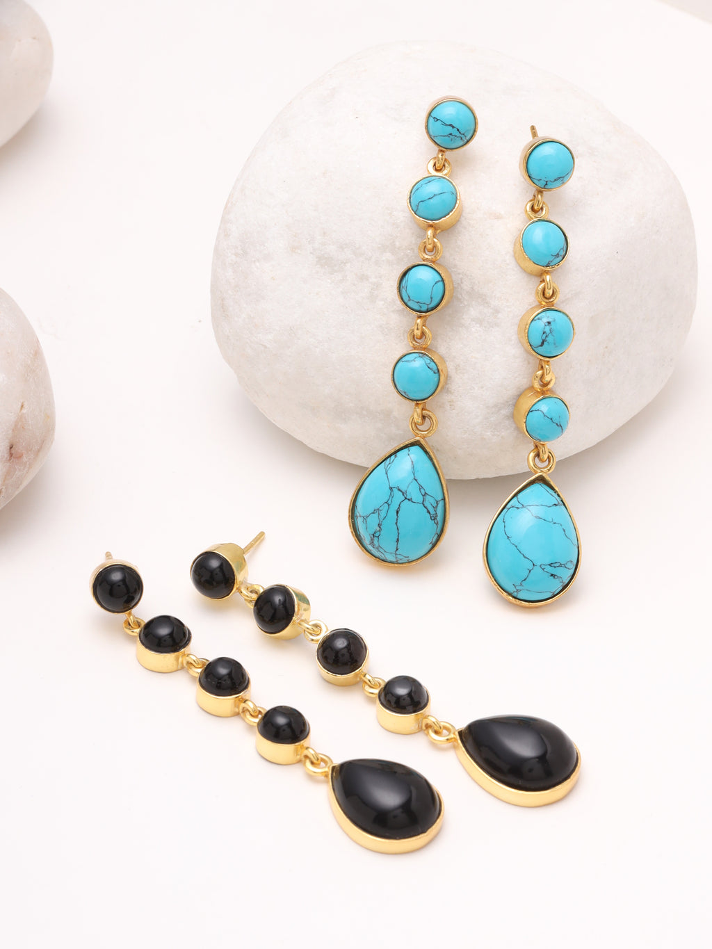 Make a striking statement with these elegant turquoise drop dangle earrings, designed to showcase timeless beauty with a contemporary touch. Featuring a sequence of round turquoise stones leading to a graceful teardrop-shaped turquoise pendant, each stone is beautifully framed in a warm gold-tone setting.