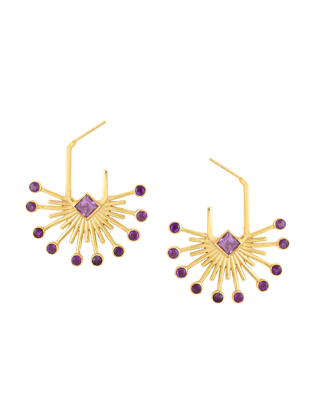 Add a touch of celestial elegance to your jewelry collection with these Amethyst Radiance Statement Earrings. Crafted in a striking sunburst design, each earring features a natural amethyst gemstone at its heart, complemented by delicately set round amethyst accents that catch the light from every angle. The rich purple hue of amethyst beautifully contrasts with the warm gold-tone finish, creating a look that is both contemporary and timeless.