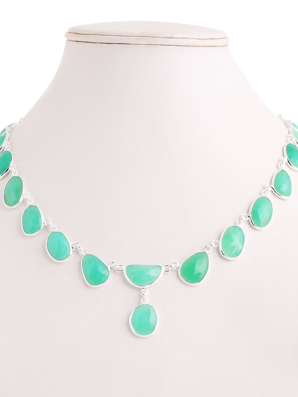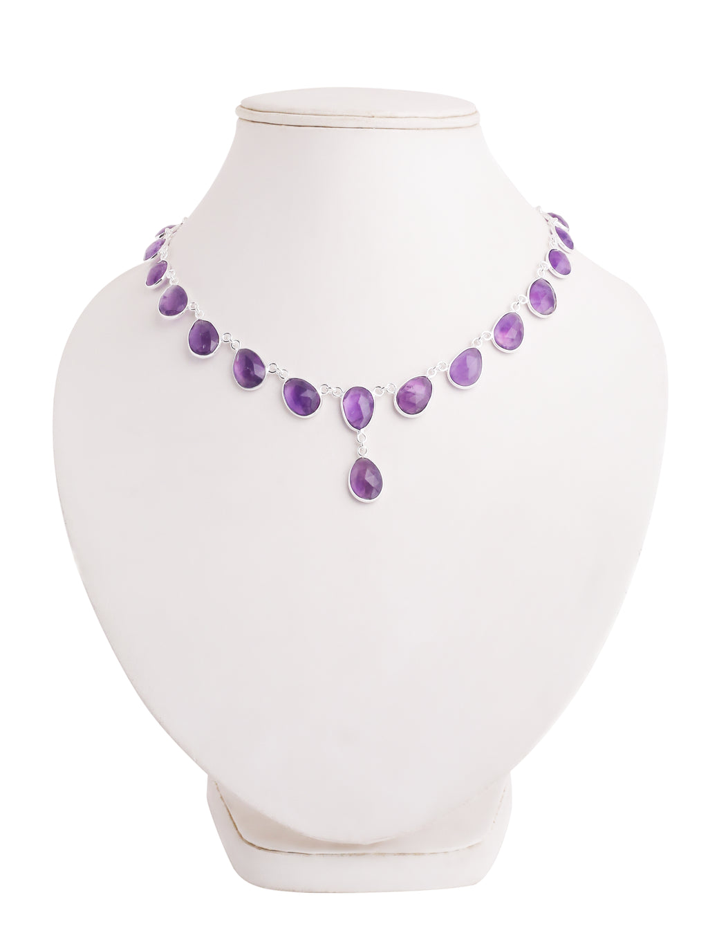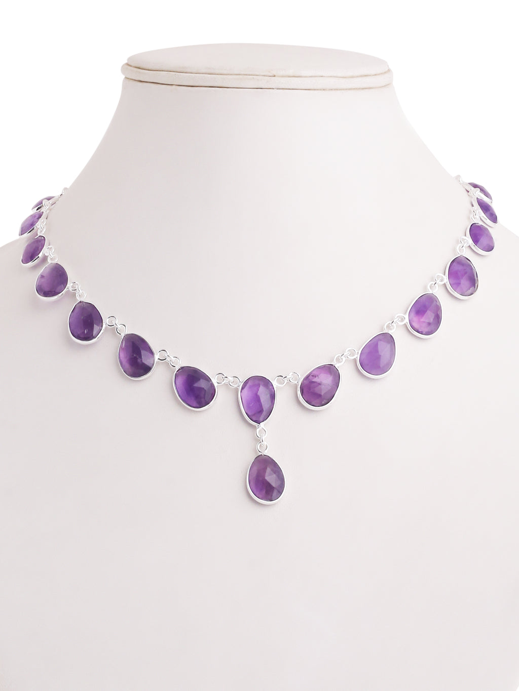 Elegant and timeless, this handcrafted silver plated necklace showcases a graceful arrangement of faceted gemstones, each set in a polished silver bezel. The stones are thoughtfully linked to create a fluid silhouette that rests beautifully along the neckline, while a delicate teardrop-shaped pendant at the center adds a refined focal point.
