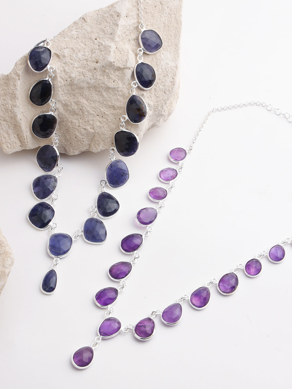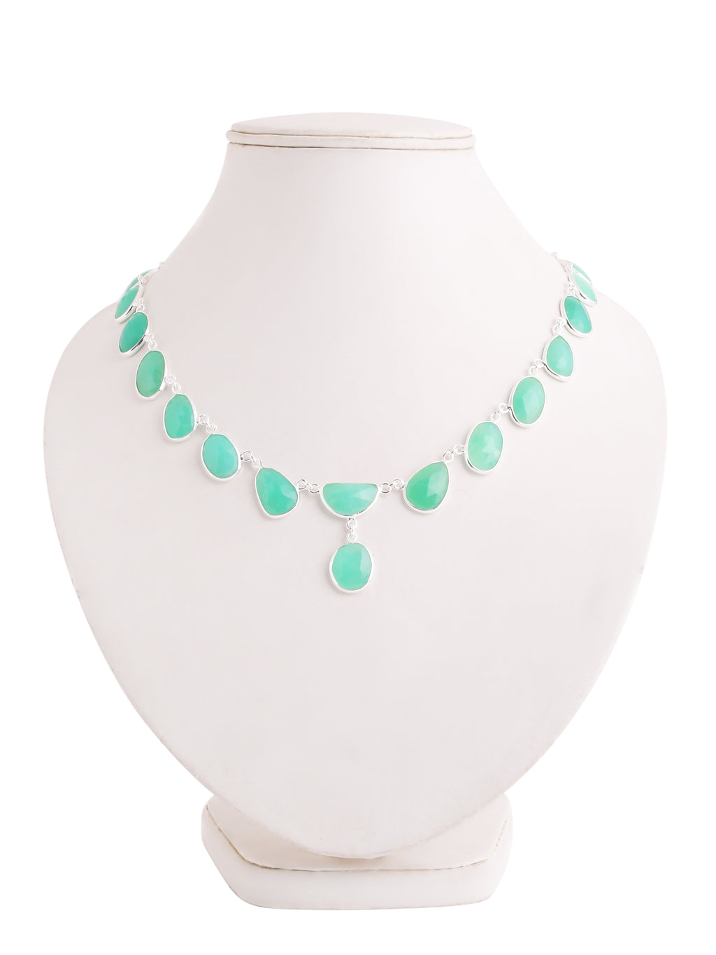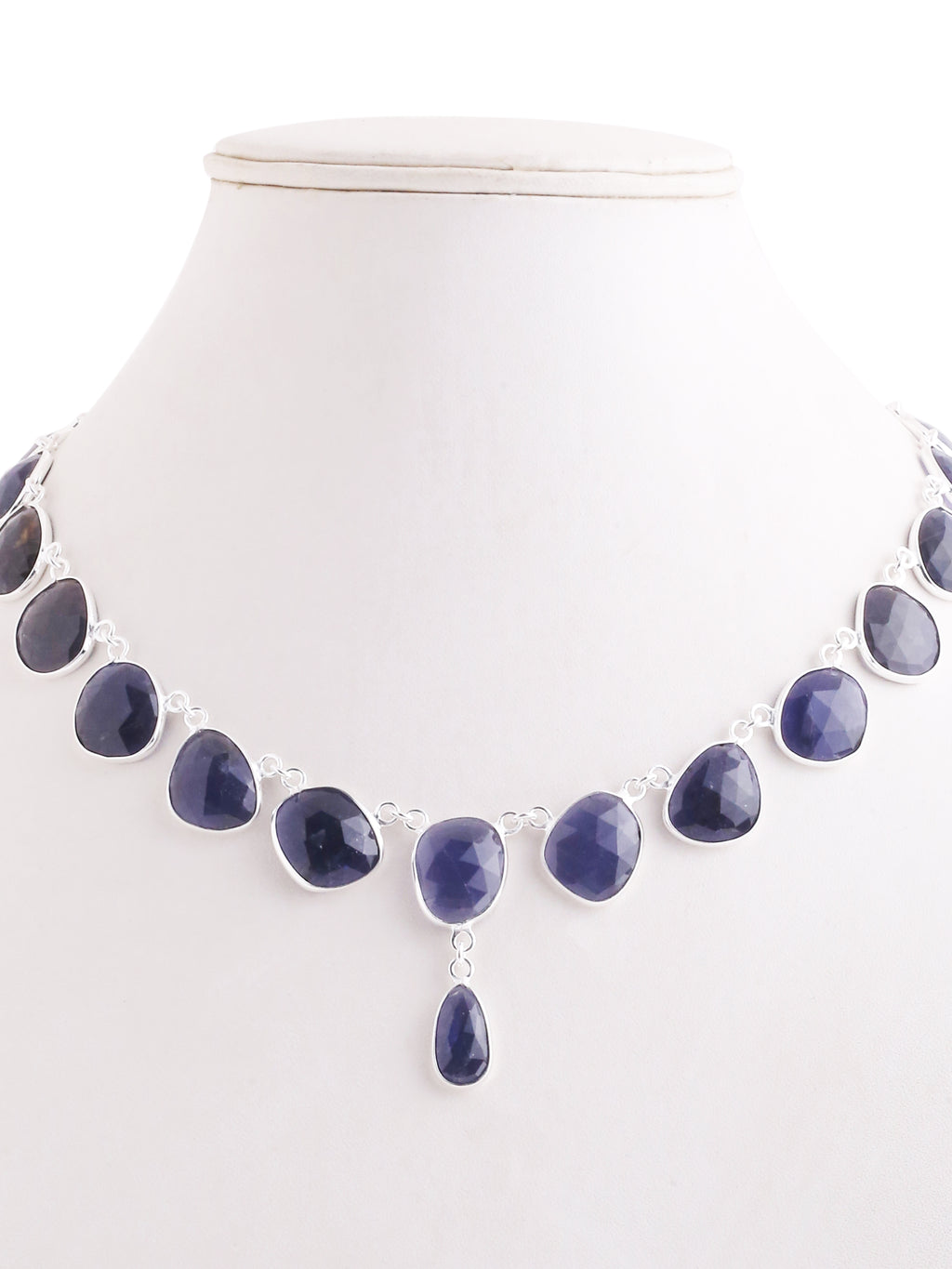 Elegant and timeless, this handcrafted silver plated necklace showcases a graceful arrangement of faceted gemstones, each set in a polished silver bezel. The stones are thoughtfully linked to create a fluid silhouette that rests beautifully along the neckline, while a delicate teardrop-shaped pendant at the center adds a refined focal point.